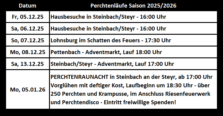 Höhepunkt der Saison ist die mittlerweile schon traditionelle Perchtenraunacht in Steinbach/Steyr, die bereits seit dem Jahr 2000 immer am 5. Jänner veranstaltet wird.